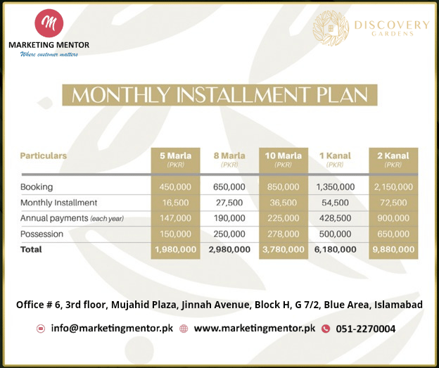 Discovery Gardens Islamabad Housing Society has a variety of payment options for residential plots. The rates are pre-launch prices of Discovery Gardens Islamabad, and they can be changed by management at any time without prior notice to investors. Book your plot on old rates from Marketing Mentor, the price plan are as follows: