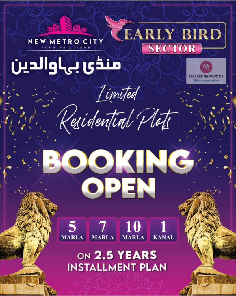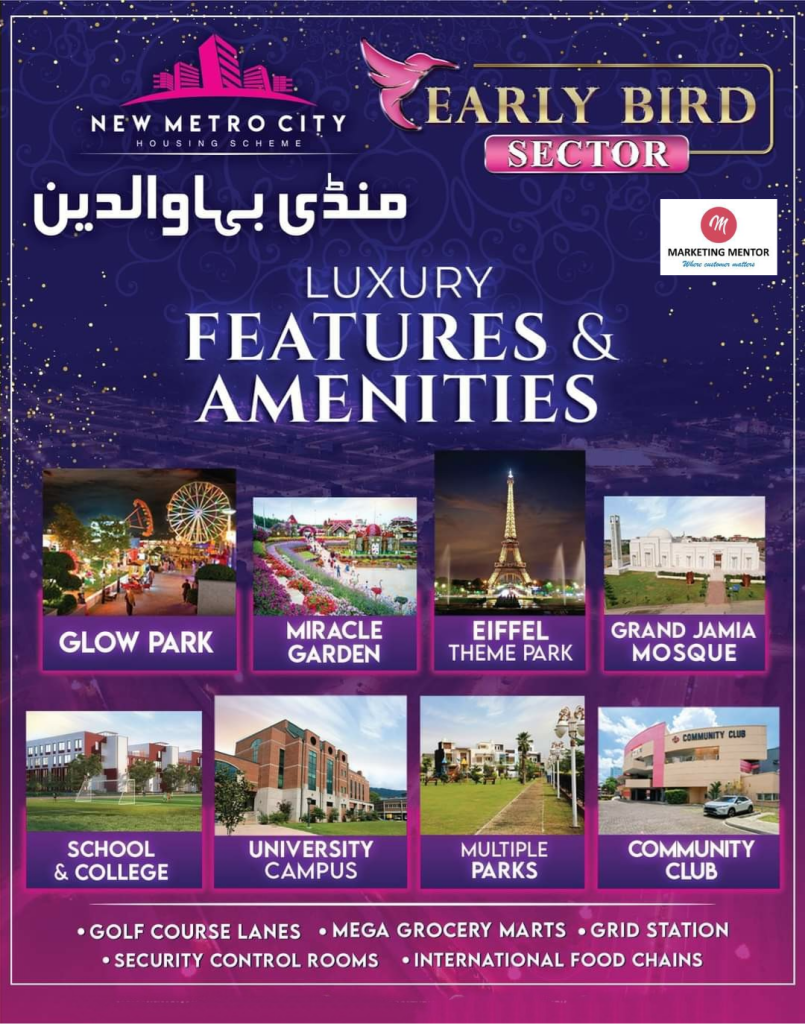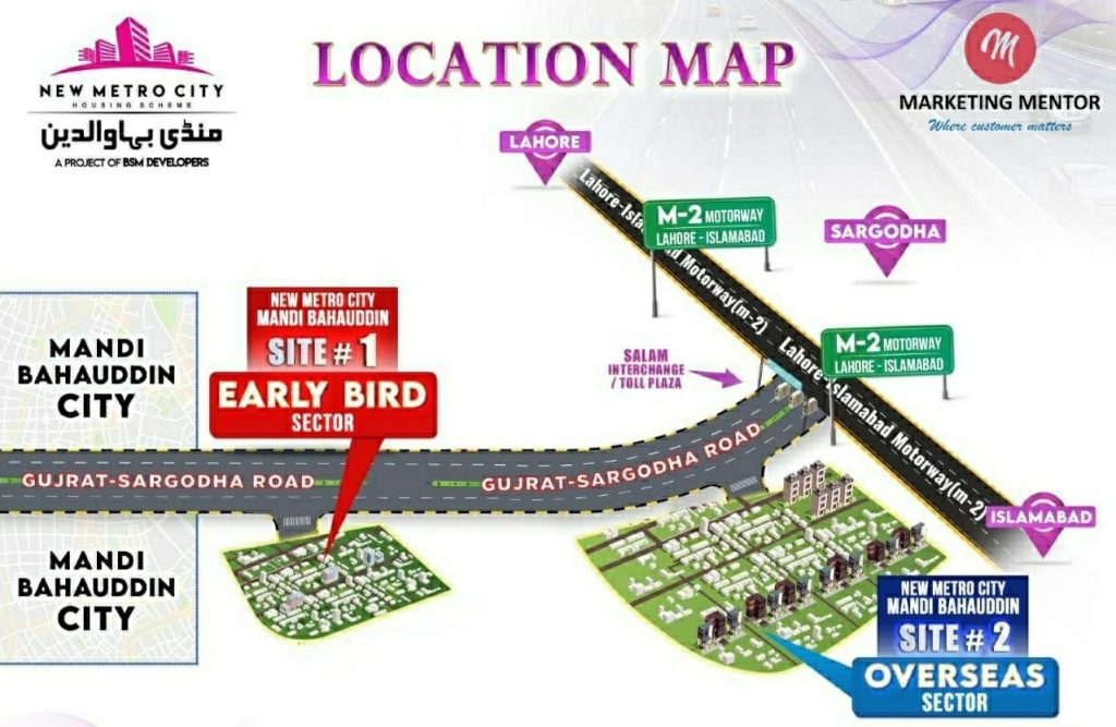 After getting huge success with New Metro City Kharian and New Metro City Gujar Khan, BSM Developer is going to bring a new project named “New Metro City Mandi Bahauddin.” It is a well-planned, modern, and spacious community. This place is packed with world-class amenities, indicating a comfortable and well-maintained lifestyle where basic and advanced facilities of all kinds are available, not much away from your residence. Here, different-sized residential and commercial plots are available from which the buyers can choose at their convenience.