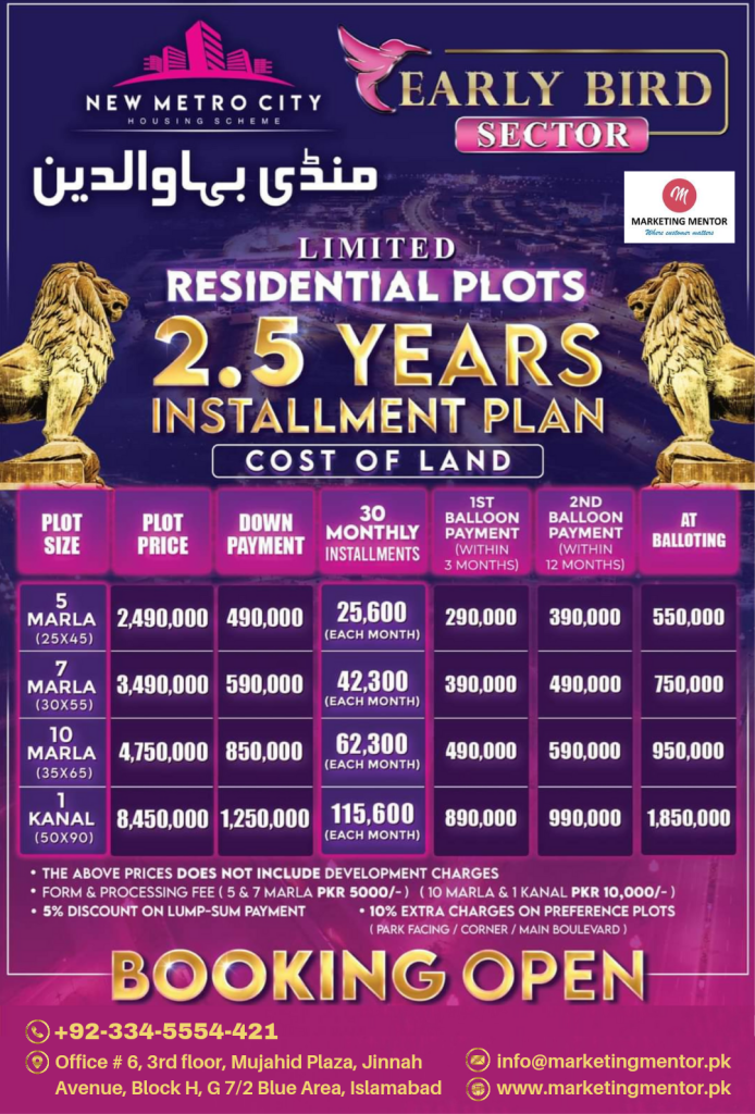 New Metro City Mandi Bahauddin has designed the most attractive and best payment plan for its buyers. This community is offering residential as well as commercial plots at different prices. The plot can be reserved here with a certain amount of down payment and an easy 5-year installment plan.