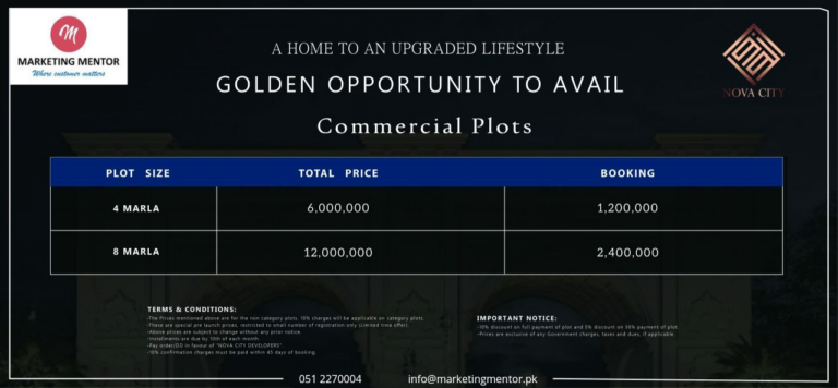 Nova City commercial plots are the most recent launch of the housing society. Currently, commercial plots are available in two sizes: