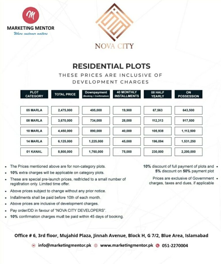 Nova City’s owners have officially announced a payment plan for investors and interested people. The price distribution of The Nova City as per plot categories. These residential plot cuttings from The NC are quite appealing and affordable, so it’ll be beneficial to avail prelaunch rates because the prices are going to rise in near future.