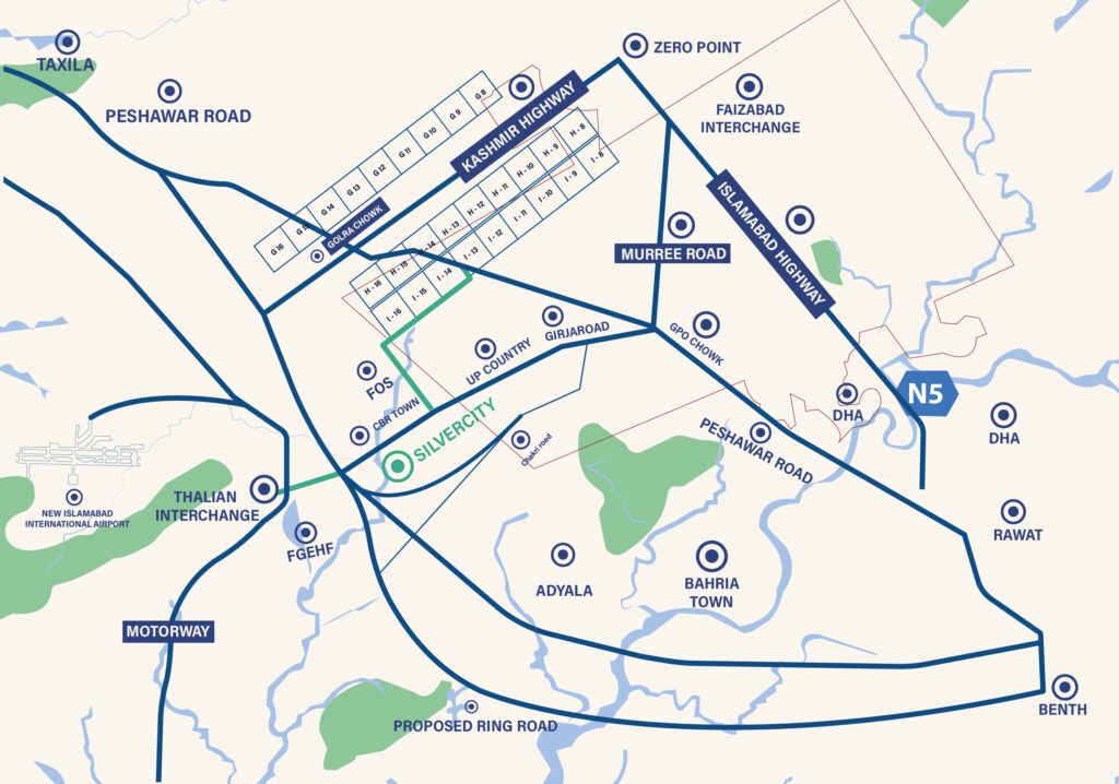 The scheme is on Girja Road, barely ten minutes from Islamabad’s new airport and twelve kilometers from Peshawar’s Quaid-e-Azam Hospital. Additionally, Ring Road Rawalpindi is directly connected to it, and additional upscale housing developments (Up Country Enclosure, Cbr Phase 2, etc.) are within walking distance.